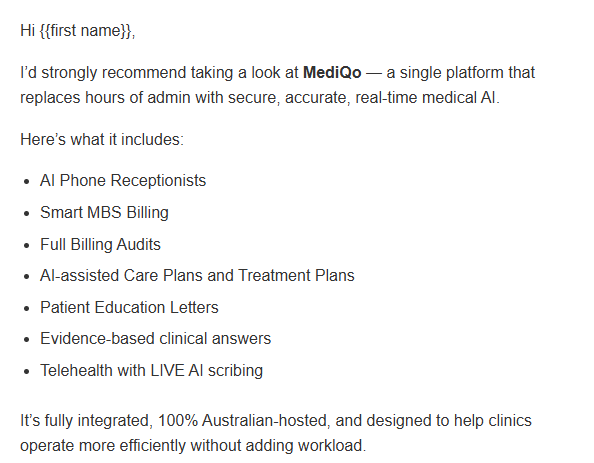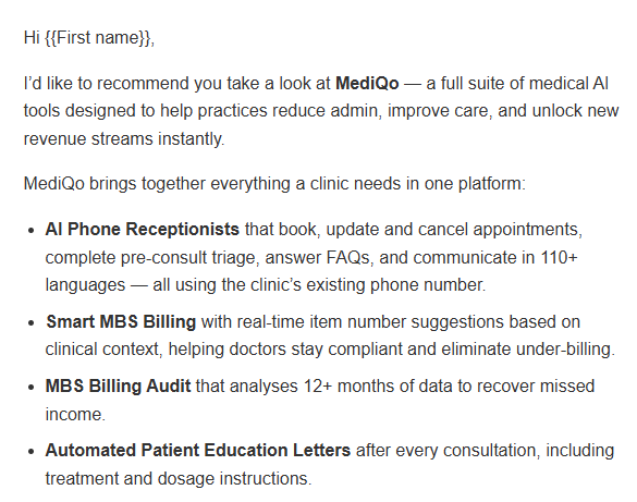 - Smart MBS Billing with real-time item number suggestions based on clinical context, helping doctors stay compliant and eliminate under-billing.