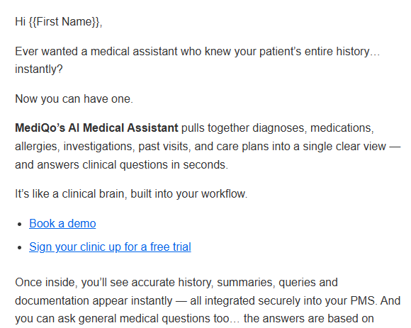 MediQo’s AI Medical Assistant pulls together diagnoses, medications, allergies, investigations, past visits, and care plans into a single clear view — and answers clinical questions in seconds.